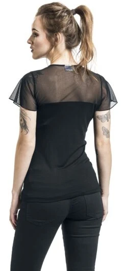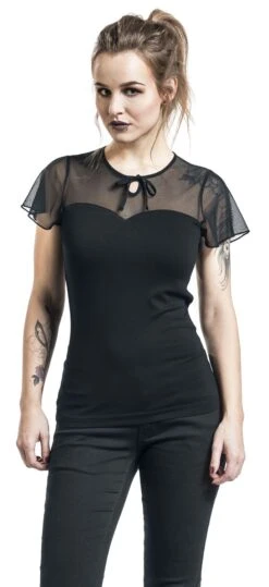 With the ‘Lovely Chic Shirt’ from Pussy Deluxe, you’ll be perfectly outfitted for even the most elegant party. The top third of this black t-shirt is transparent. It features an eye-catching keyhole detail at the neckline that draws attention to the décolleté – which is further accented by the the arch-like line. A fitted cut and delicate butterfly sleeves complete the romantic look.
