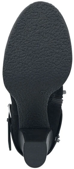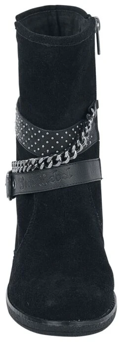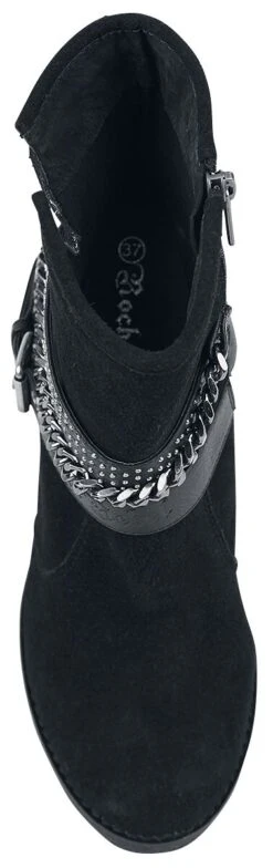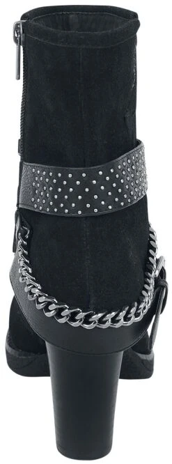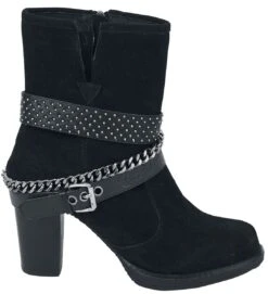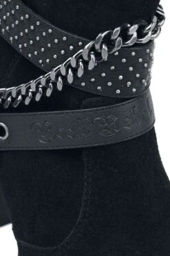 Suede boots with chains and buckles. The heel is approx. 9 cm high. The shoe features a zipper on the inside to open.